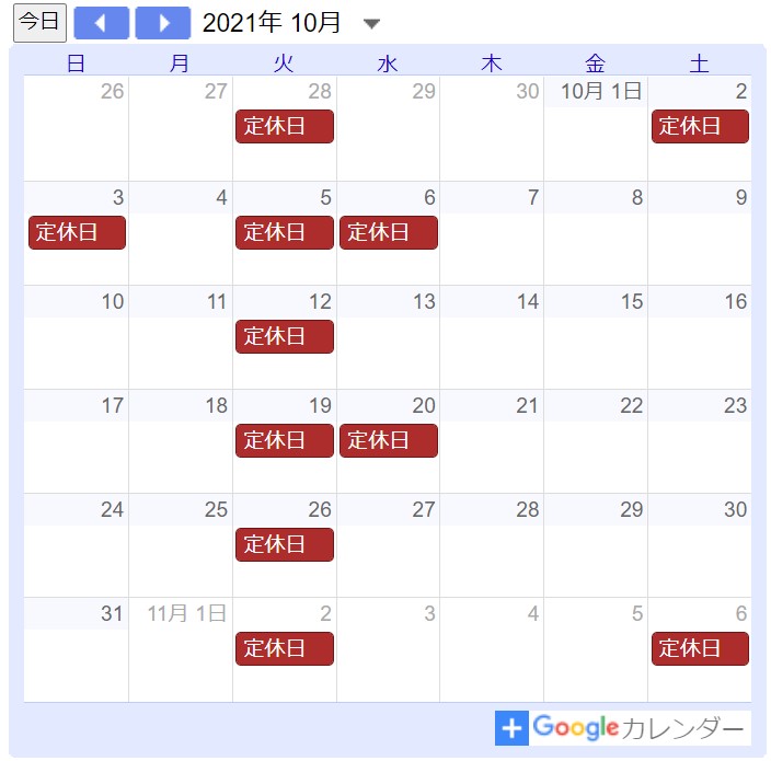 ・2021年10月の定休日