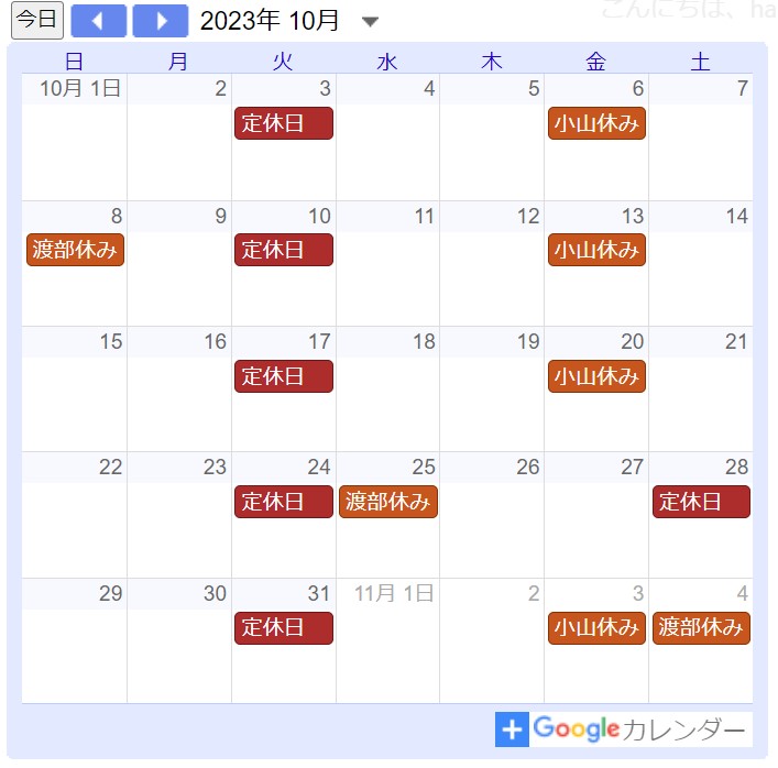2023年10月の定休日