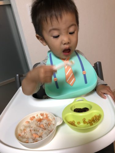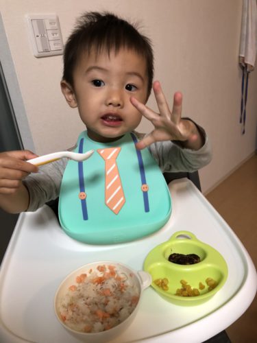 元気よくガッツいて食事をとる息子。