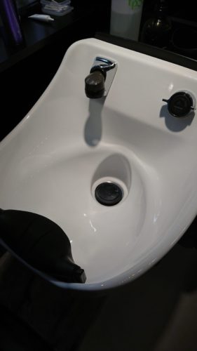 ①カラーリングの施術後、カラーのお薬をお流しした後、そのままシャンプー台で
