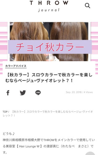 どうも♪ 神奈川県相模原市相模大野でTHROWをメインカラーで使用している美容室【 Hair Lounge W 】の渡部真仁(わたなべ まさと)です。