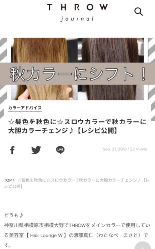 どうも♪ 神奈川県相模原市相模大野でTHROWをメインカラーで使用している美容室【 Hair Lounge W 】の渡部真仁(わたなべ まさと)です。