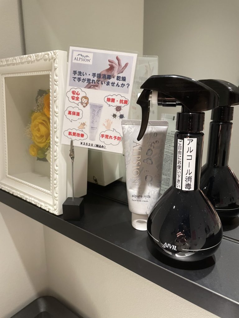 (アルコールミスト・アルコールハンドジェル・除菌抗菌用ハンドクリームをご用意しています)